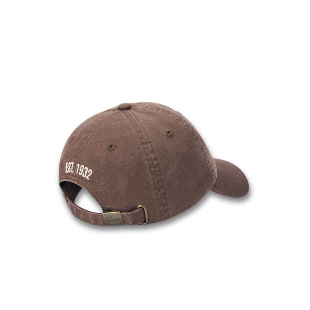Crafted from 100% organic cotton twill, this cap features an embroidered archive-inspired logo and an adjustable strap with a brass branded logo metal clasp.