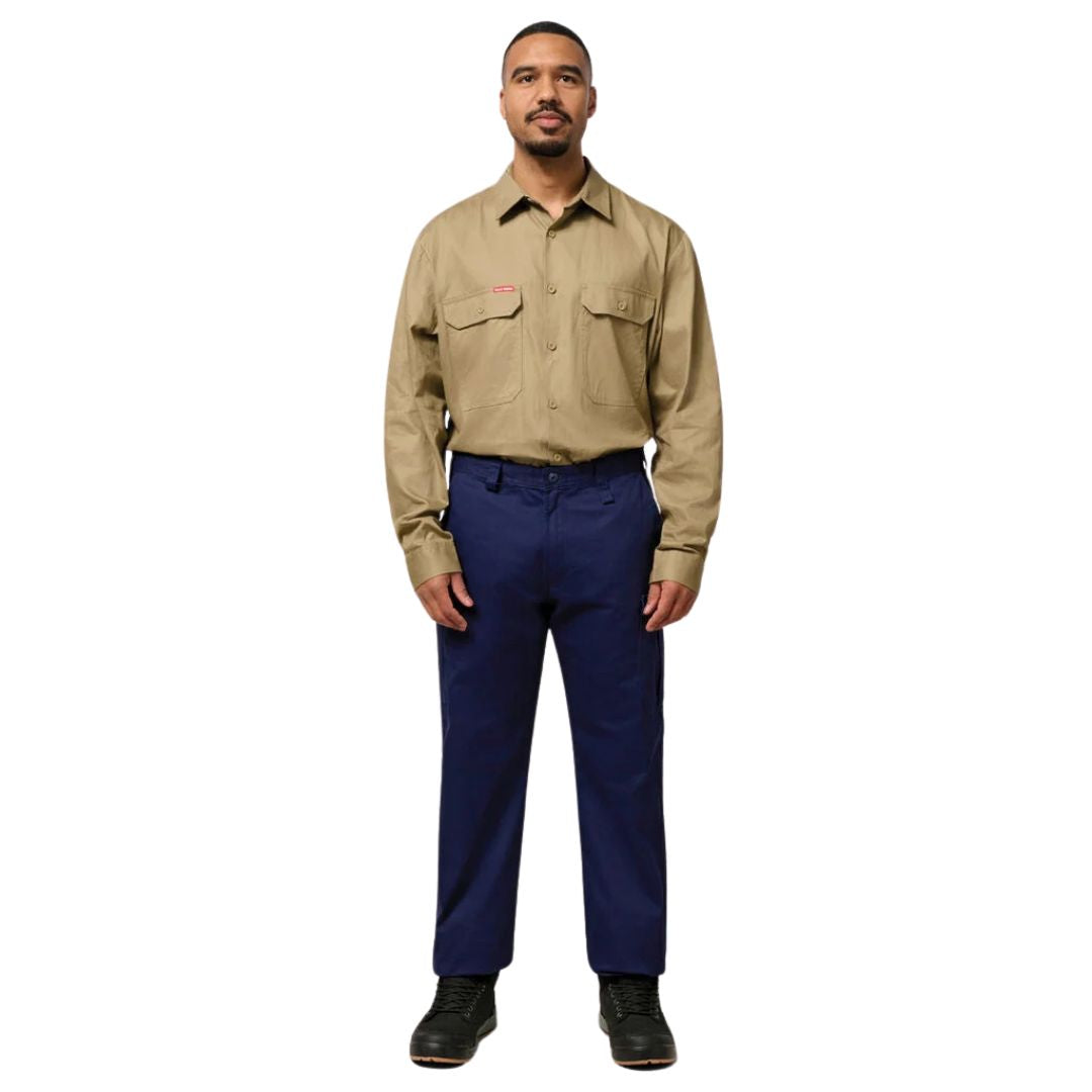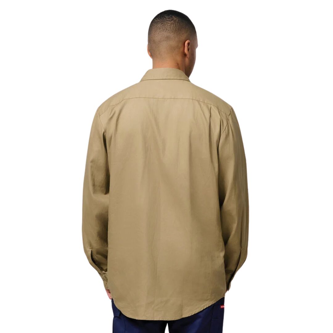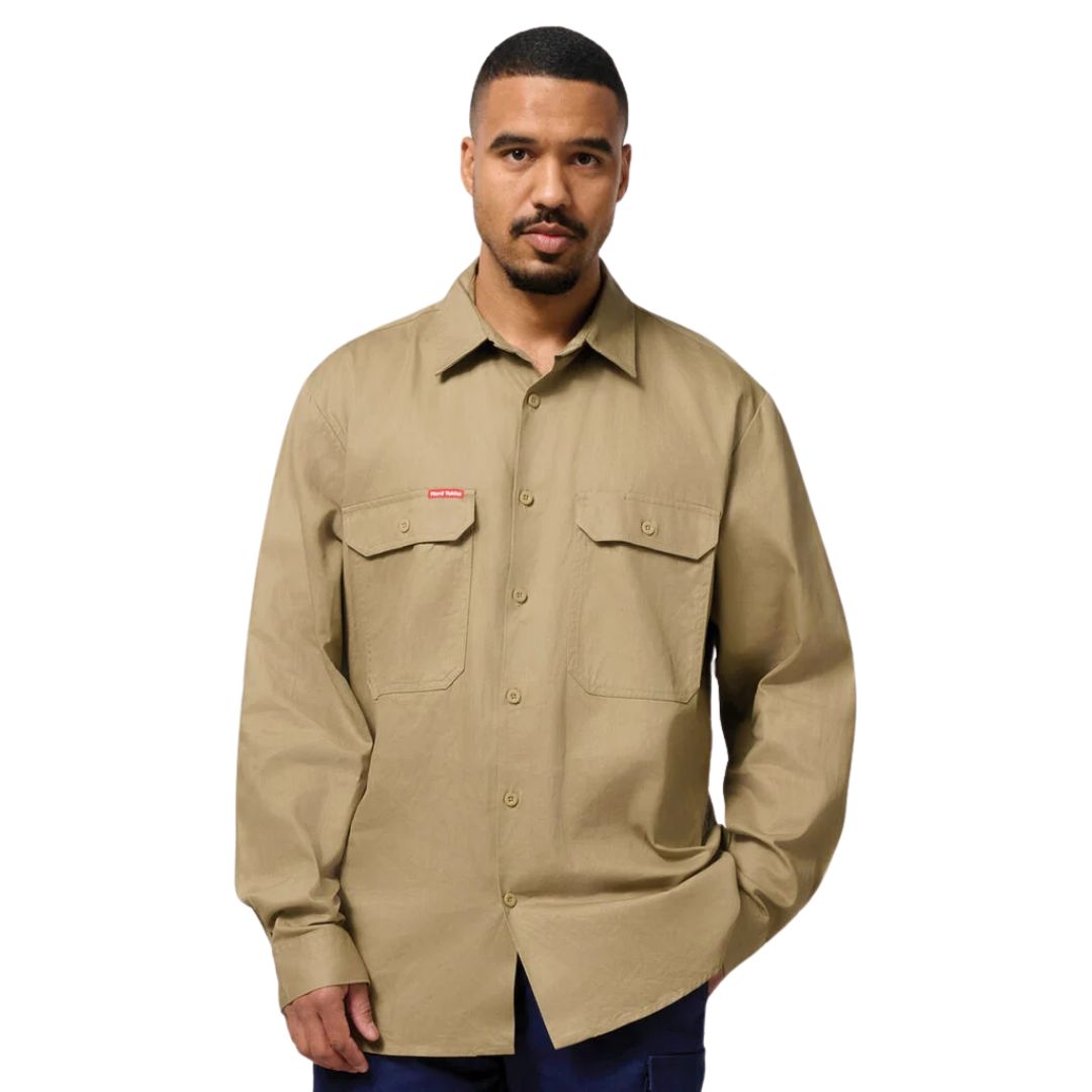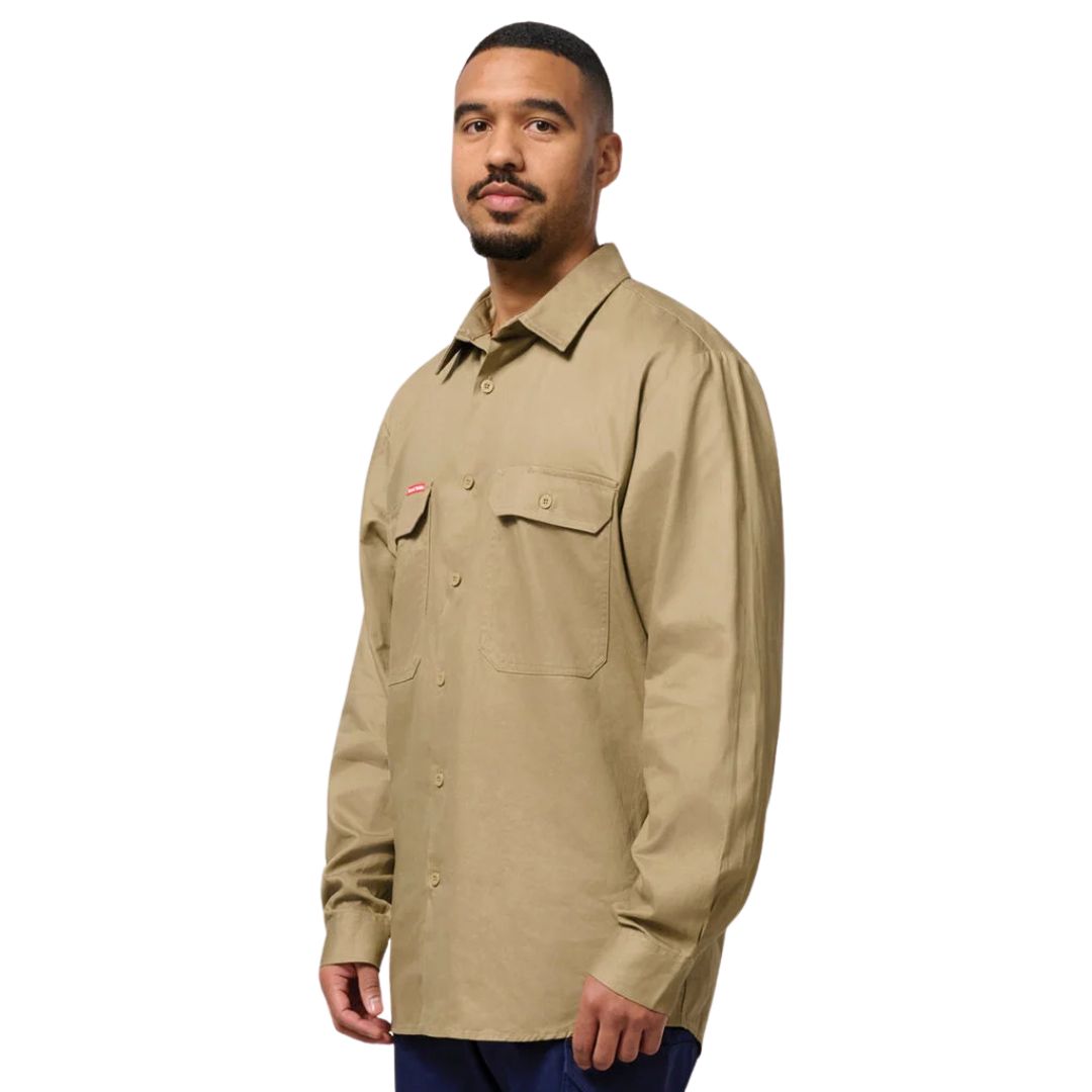 Form meets function in this long sleeve, open front, pre-shrunk cotton drill Hard Yakka work shirt. Featuring a two piece collar for added sun protection.