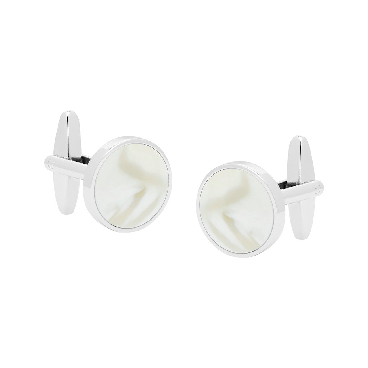 Add a touch of timeless elegance to your formalwear with these round cufflinks, featuring a polished nickel finish and classic mother of pearl inlay. Our Mother of Pearl cufflinks hail from oyster shells. Like a fingerprint, each cufflink is unique, presenting milky white and pale green characteristics.