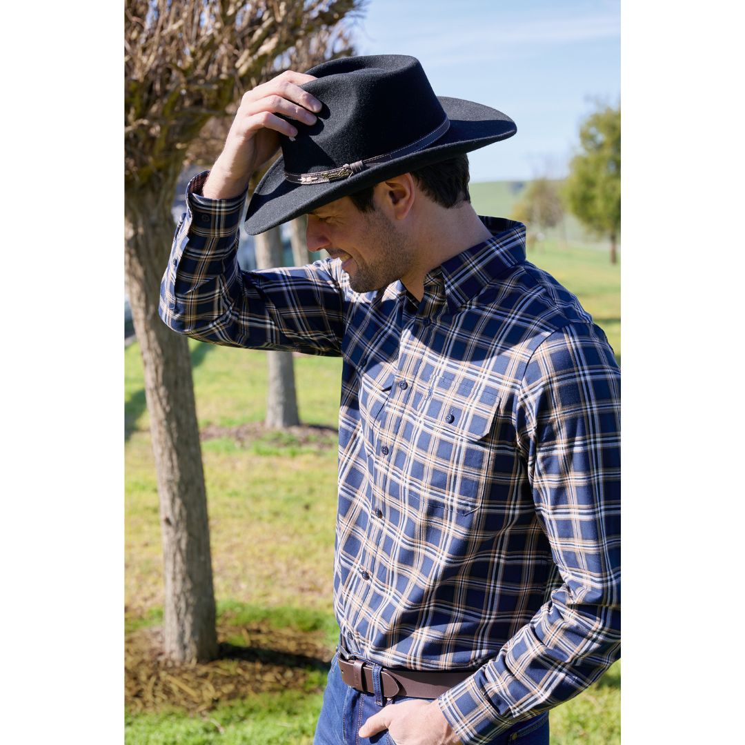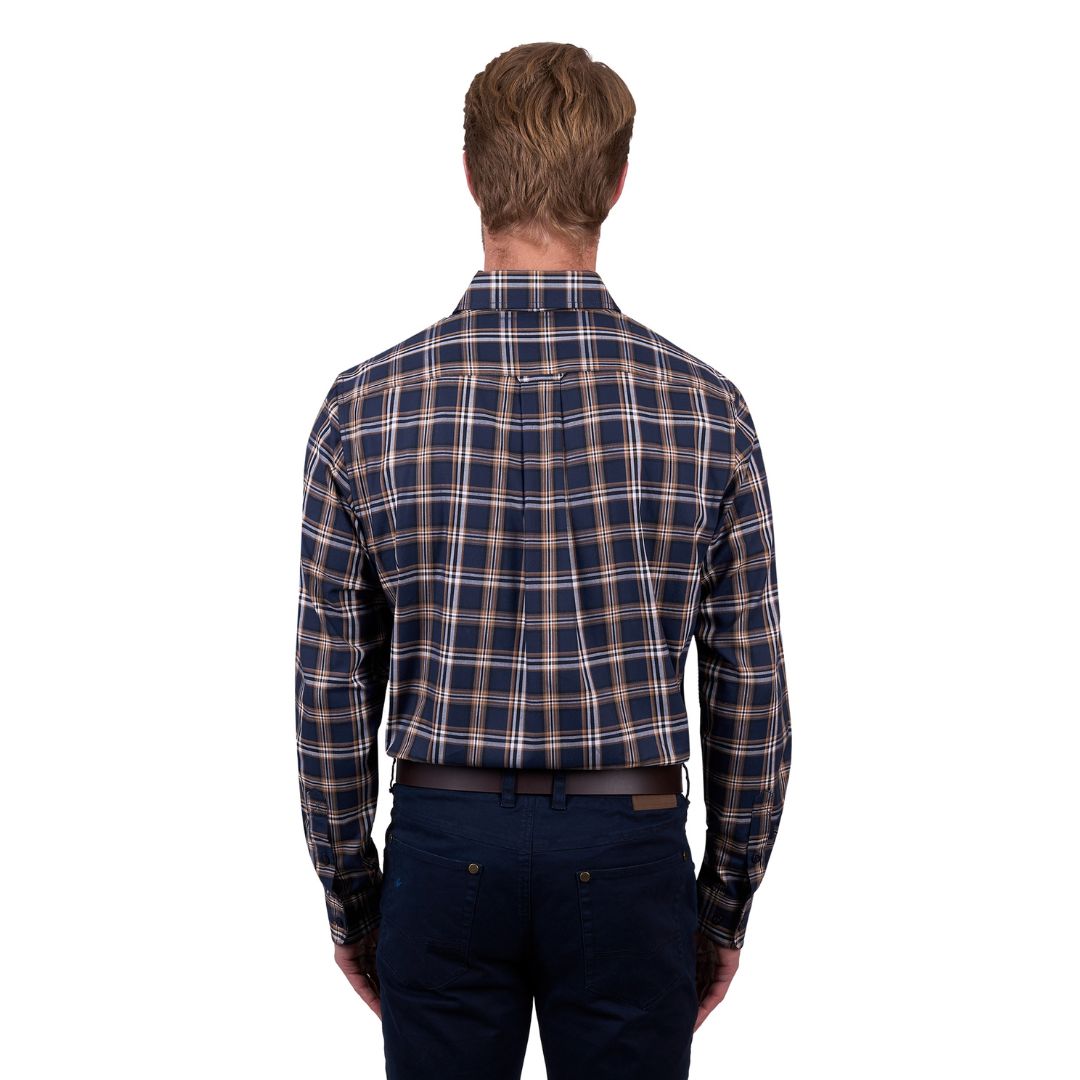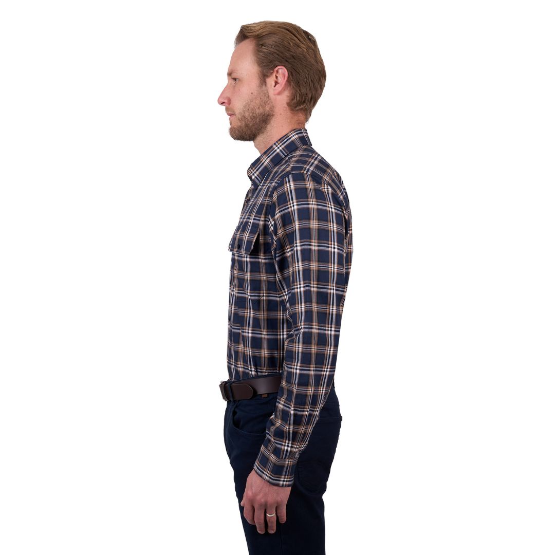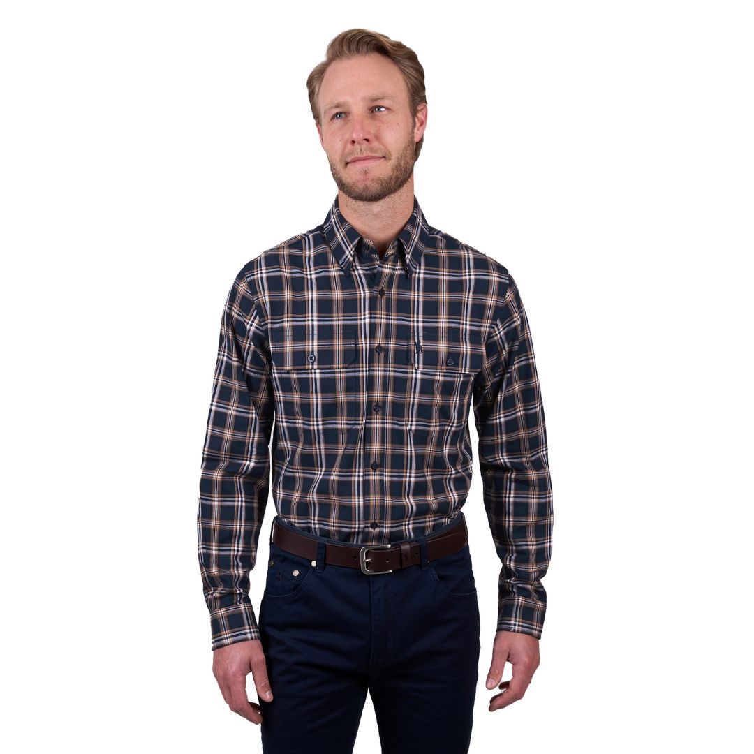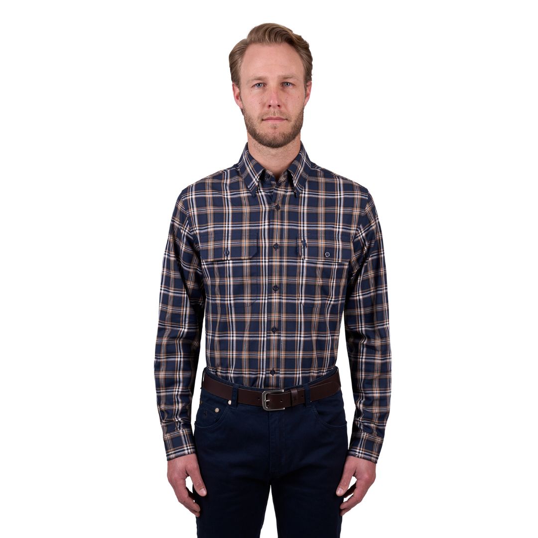 The Thomas Cook Mens Dylan Shirt features a 100% cotton yarn-dyed check in navy tan with countryman pockets. The long shirt tail and back pleat allow this shirt to move with you and keep you covered up, perfect for long days outside - and look good doin' it!