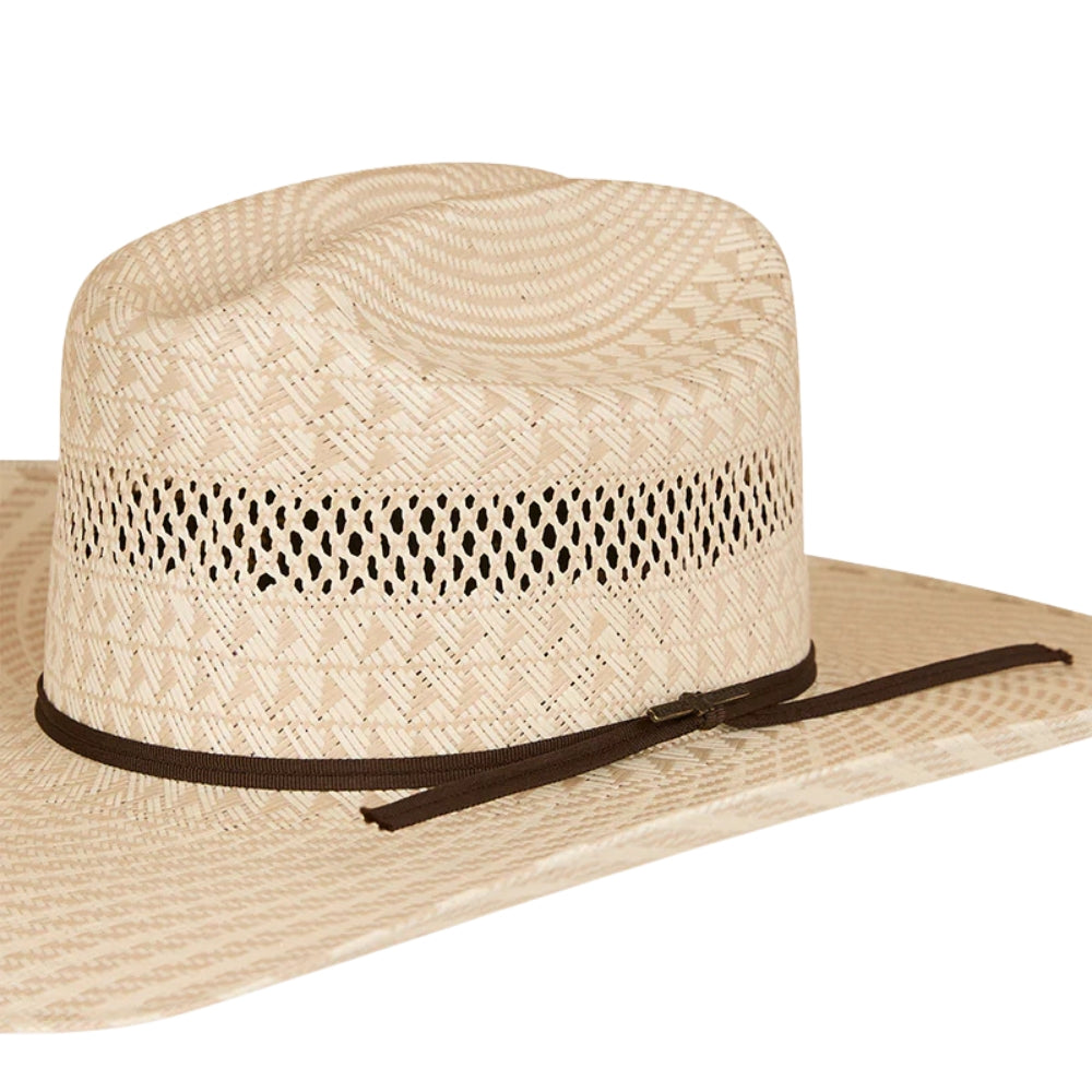 A striking two-tone woven pattern creates a bold mosaic-like effect, making the Wesley a true statement piece in any Western wardrobe. Finished with a contrasting grosgrain ribbon band and an antique brass Ringers Western hat pin, this hat combines elegance with rugged charm.
