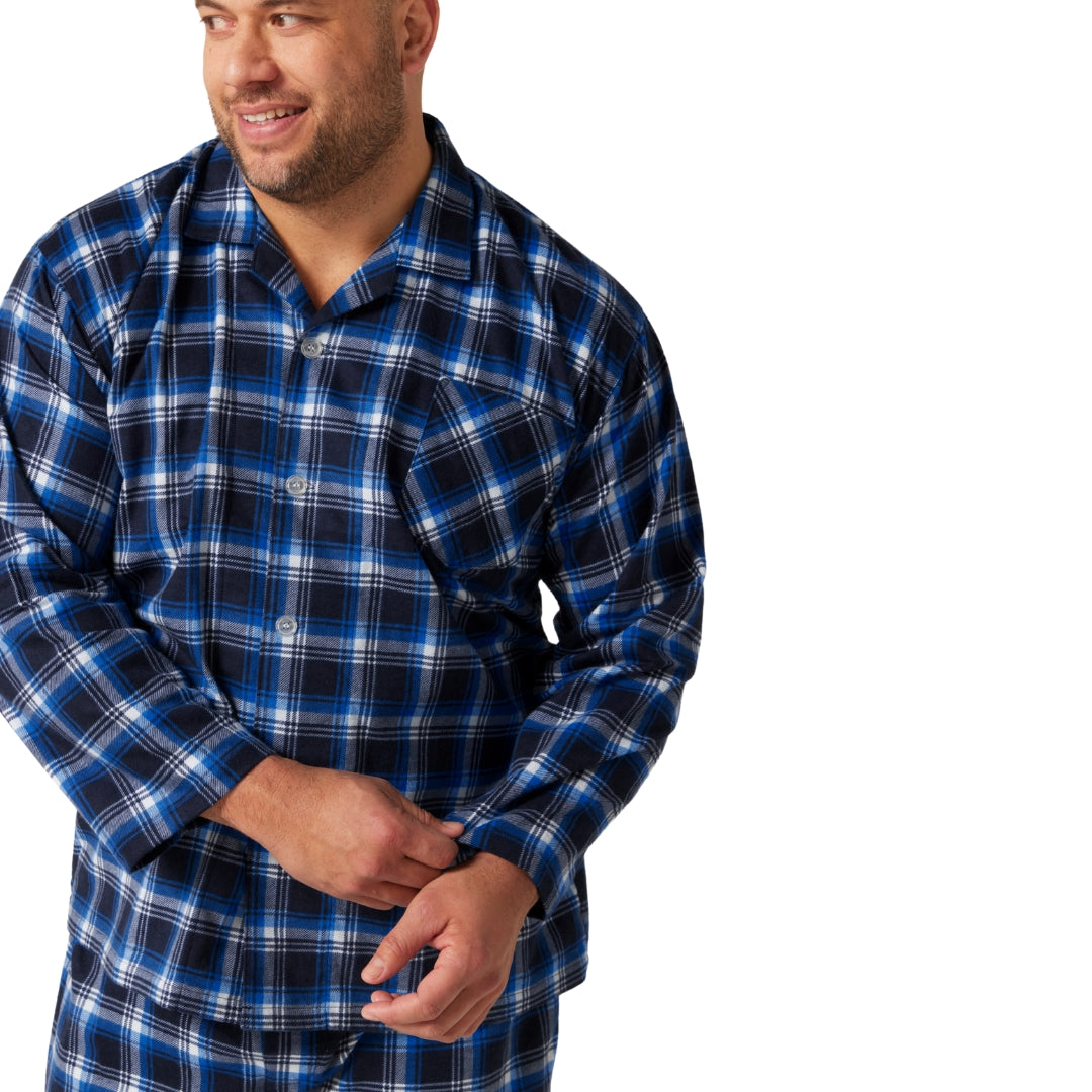 The long sleeve shirt is a classic cut, has a collar and revere opening to the top button, a single chest pocket, cut on the cross-grain for subtle detail. The buttons are contrast white, our signature style. The pants are a classic cut and fall straight from the hips with a concealed button fly-front and elastic waistband with ties. They are perfect for sleep or lounging around home in.